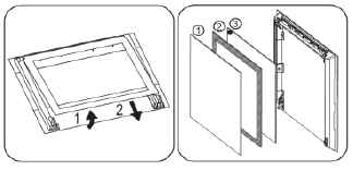 kapıyı hafif açık konumda yukarı çekerek çıkartabilirsiniz.Camlı kapak ağır olduğundan, dikkatli olunuz.!!!