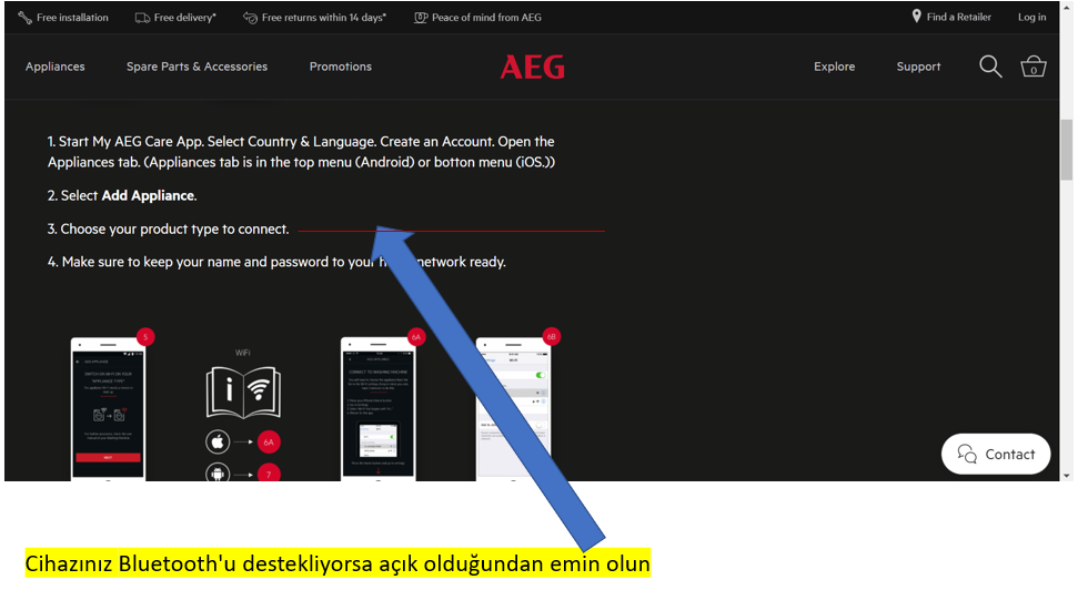 Bağlantının yapılabilmesi içininternet üzerinden AEG Care Uygulaması Başlangıç Kılavuzunu kullanılaçak cihaza indirim yapılması gereklidir.